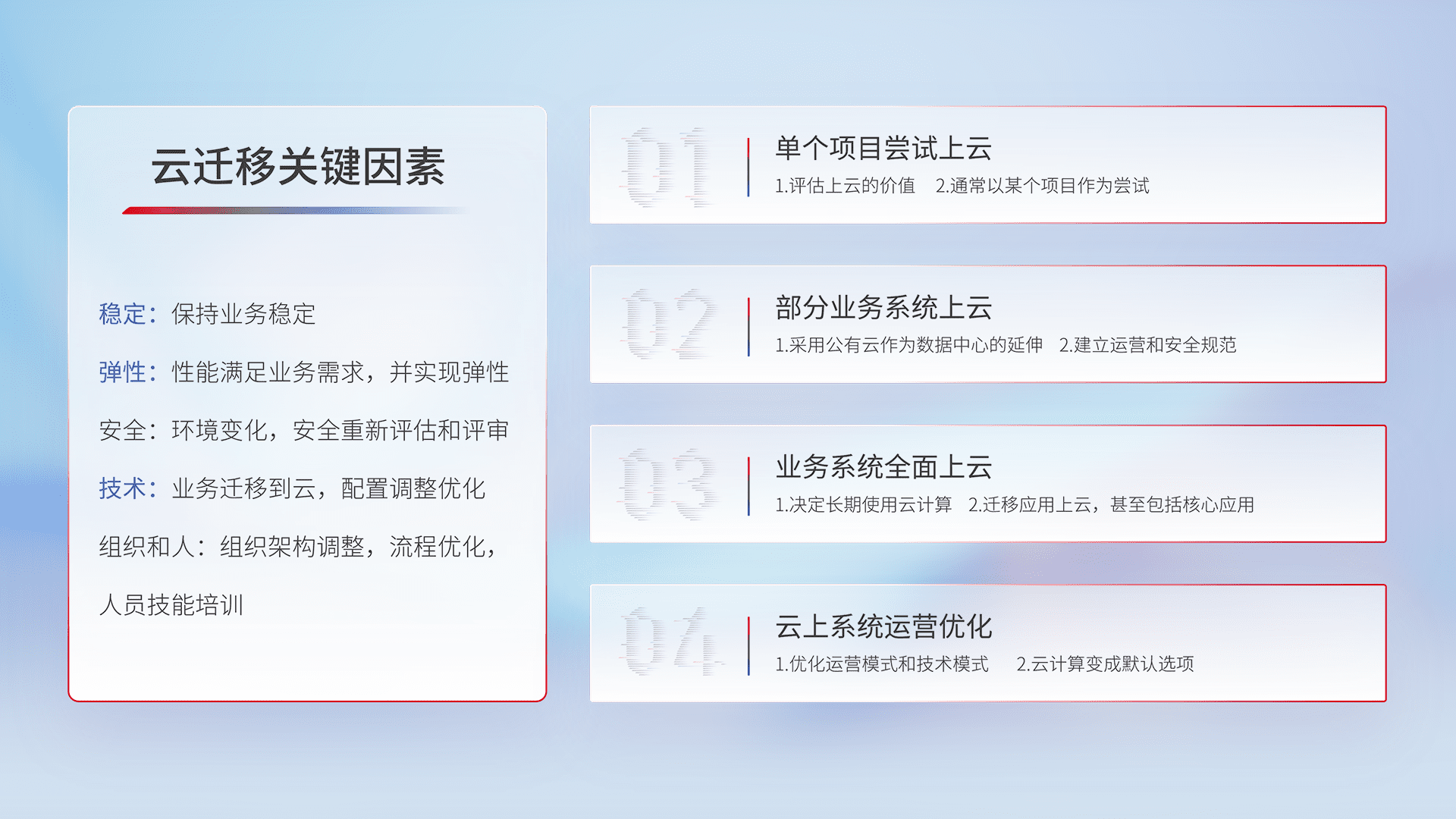 结合实际业务,,,从规划设计、、、、云平台选型、、、、云原生改造、、、数据迁移、、集成交付,,迁移全过程为客户识别最佳上云路径,,做好风险识别管理,,,,设计网络架构、、身份权限、、安全审计合规、、操作审计、、、、日志审计、、、、监控告警策略、、、、多站点容灾设计等,,对云上基础设施进行整体规划,,提升IT治理水平,,,以满足弹性、、高可用、、高性能的需求。。。