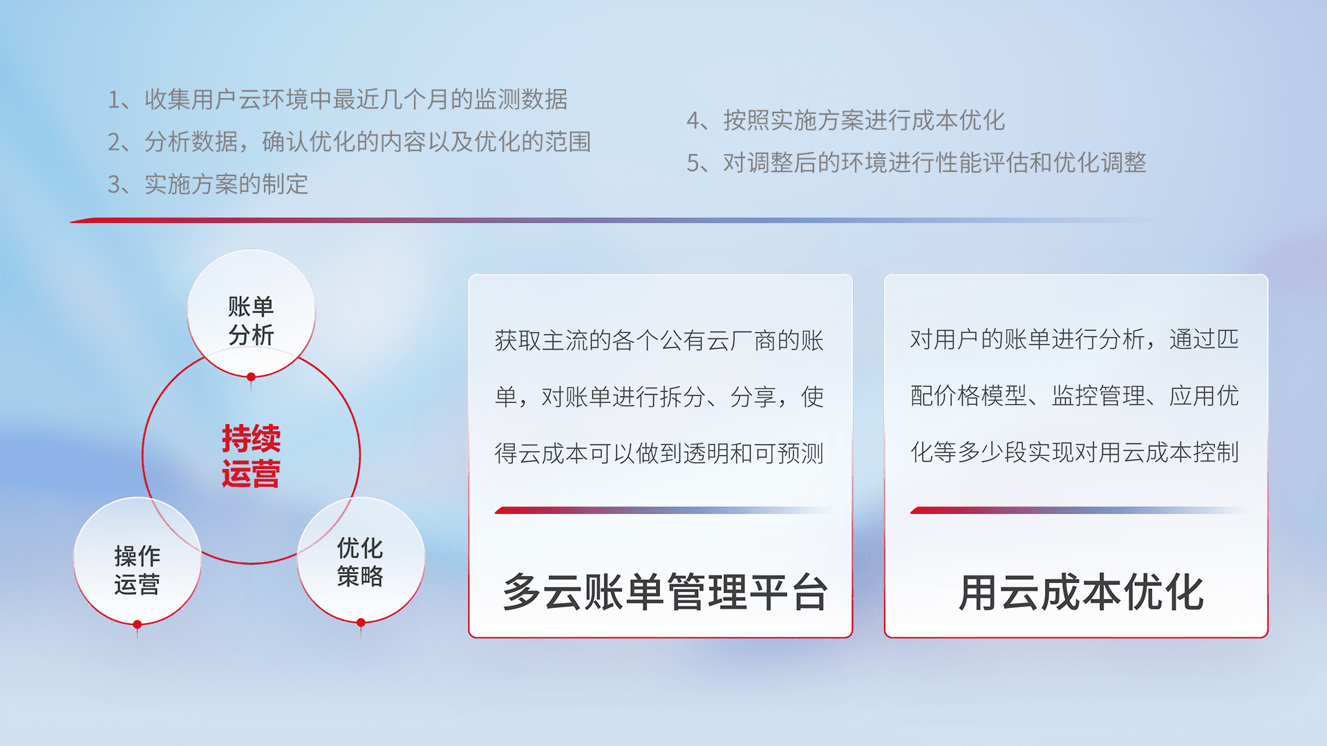 通过多云纳管,,,以统一的资源数据模型把客户的云资源进行抽象和封装,,,进而实现对多云资源的统一操作,,,,保障云资源管理的可靠性、、、稳定性与可用性。。。量身定制化运维内容,,,,配置、、、、开发运维、、、、补丁管理、、、备份、、监控、、认证和访问管理、、审计和日常巡检等,,保障在用云过程中的可靠度,,稳定度以及高可用率。。。