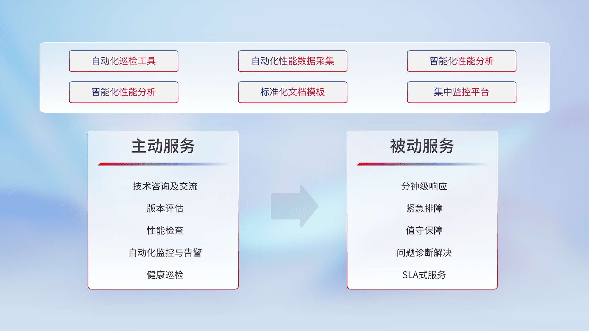 智能化工具和标准化文档,,,,保障服务质量,,,,提供主动服务(包含技术咨询、、、、版本评估、、、性能检查、、自动化监控与告警、、、健康巡检)和被动服务包含(分钟级响应、、、、紧急排障、、、值守保障、、、、问题诊断解决、、、、SLA服务)。。